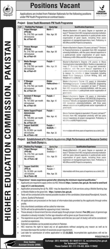 New job openings were formally posted on the Higher Education Commission Jobs 2025 website and social media accounts. Several open positions for various projects, including Youth Movement/YPA Youth Program, Project Management, Finance Manager, Media Manager, IT Manager, Assistant IT Manager, Admin Project Coordinator, Admin Project Assistant, Establishment of UK Sports Academies (High Performance and Resource Centre), Youth Olympics Project Manager & Project Administrator, are listed in the 2025 job posting published in Express Newspaper. All of these project positions are contract-based, with an initial one-year term that can be extended based on performance. Applicants are encouraged to apply for these HEC government positions from anywhere in Pakistan.